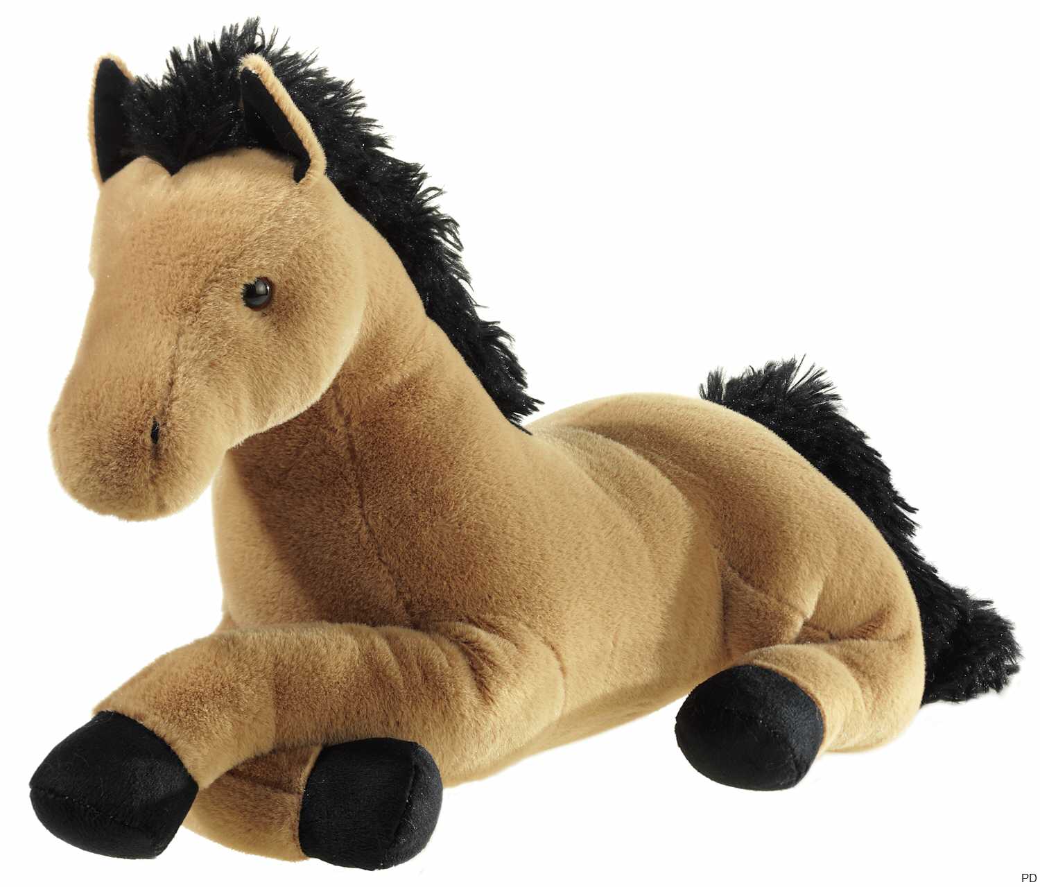 Das Stofftier Pferd hat eine schwarze Mähne und abgesetzte Hufe.