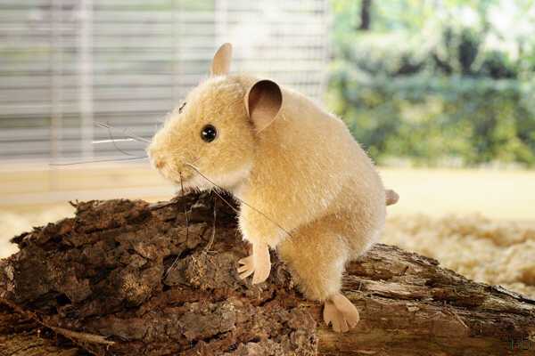 Plüschtier Hamster in liegender Position. Der Plüsch Hamster ist goldfarben, Gliedmaßen, Schwänzchen und Ohren sind beigefarben. Das Stofftier Hamster hat schwarze Knopfaugen und schwarze Schnurrhaare.