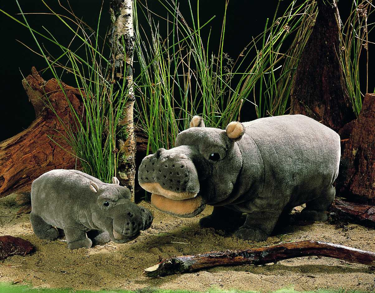 Das Flusspferd ist wie abgebildet in den zwei Varianten "stehend" (45 cm groß) und als "Mini-Flusspferd" (28 cm groß) lieferbar.