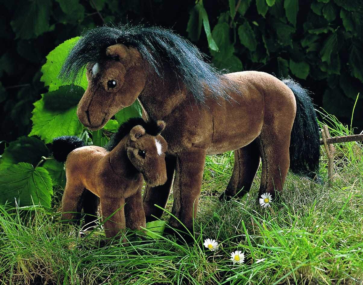Das Pferd ist wie abgebildet in den zwei Varianten "Reitpferd" (38 cm groß) und "Fohlen" (24 cm groß) lieferbar.