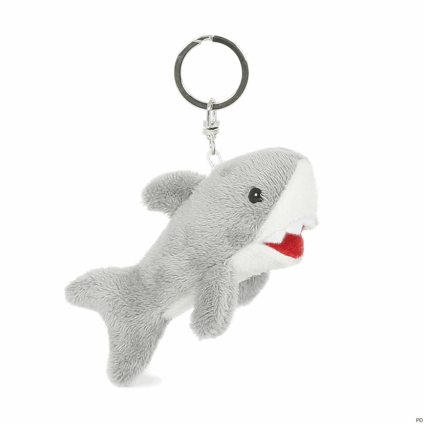 Schlüsselanhänger Hai aus kuschlig weichem Plüsch. Der Körper des Plüsch Hais ist oberseitig grau, unterseitig weiß gefärbt, das offene Maul ist rot gefärbt.