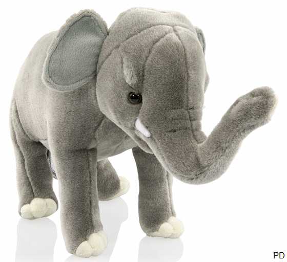 Das Fell des Stofftiers Elefant ist grau. Die Stoßzähne und die Füße des Plüsch Elefanten sind weiß, die Knopfaugen schwarz. Der Plüsch Elefant hat die für asiatische Elefanten typisch kleineren Ohren.