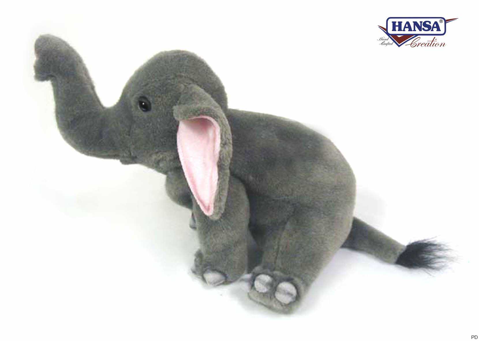 Plüsch Elefant von kräftiger Gestalt, in sitzender Position.