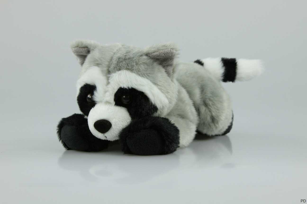 Das Stofftier Waschbär ist aus hochwertig verarbeitem, kuschelweichem Plüschmaterial gefertigt. Der Körper des Plüsch Waschbärs ist dunkelgrau gefärbt, der Schwanz schwarz-weiß gestreift. Die Pfoten des kuscheligen Waschbären sind schwarz. Das Gesicht des Plüsch Waschbären ist weiß, mit schwarzer Augenmaske und schwarzer Nasenspitze.