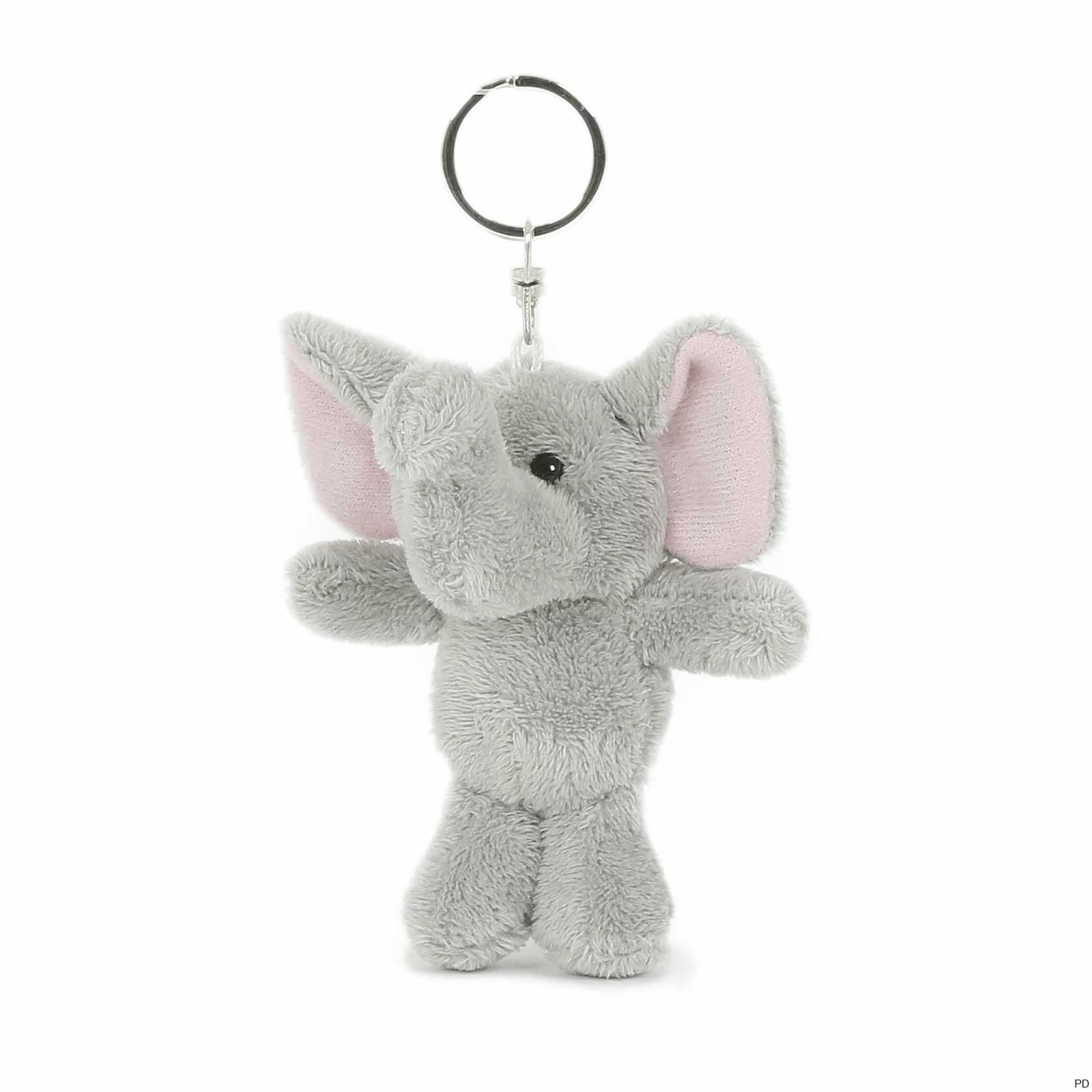 Schlüsselanhänger Elefant aus kuschlig weichem Plüsch. Der Körper des Plüsch Elefanten ist grau, die Innenohren sind rosafarben und die Knopfaugen schwarz.