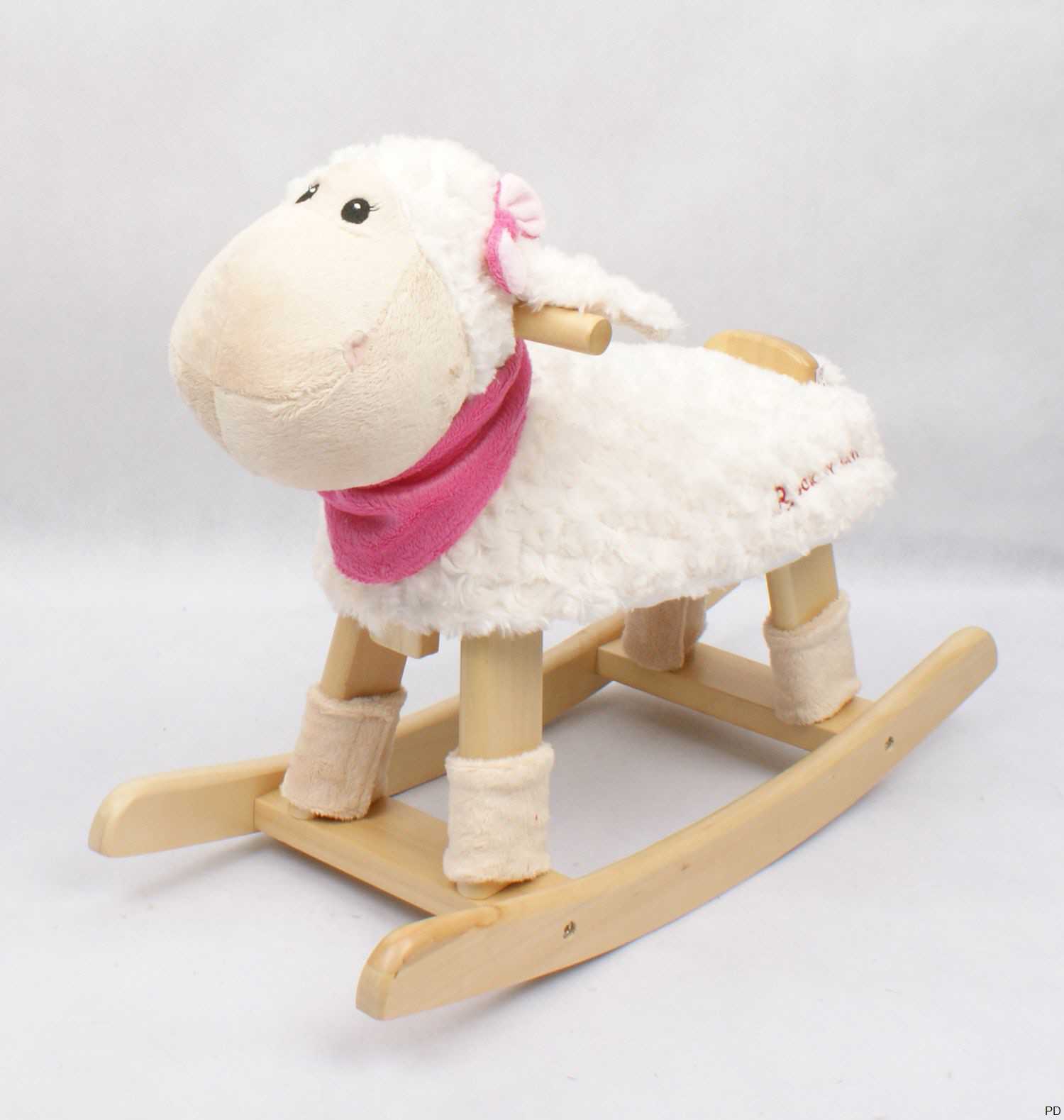 Das Schaukelschaf ist mit robusten Holz-Kufen und -Haltegriffen ausstaffiert. Der Sitz des Schaukelschafs ist sehr komfortabel mit einer weichen Schafplüschdecke ausstaffiert.