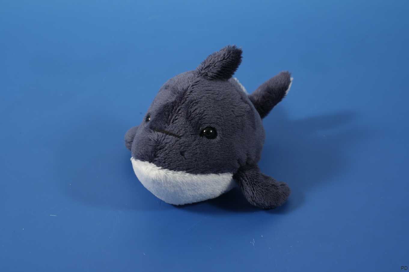 Das Stofftier Hai ist aus hochwertig verarbeitem, kuschelweichem Plüschmaterial gefertigt. Der Plüschhai ist oberseitig dunkelgrau, unterseitig weiß gefärbt und hat zwei schwarze Knopfaugen.