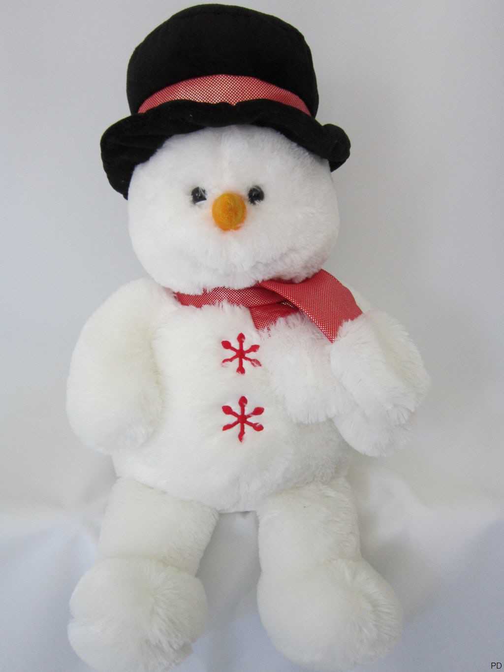 kuschelweicher Plüsch Schneemann, bekleidet mit schwarzen Hut und einem roten Schal.