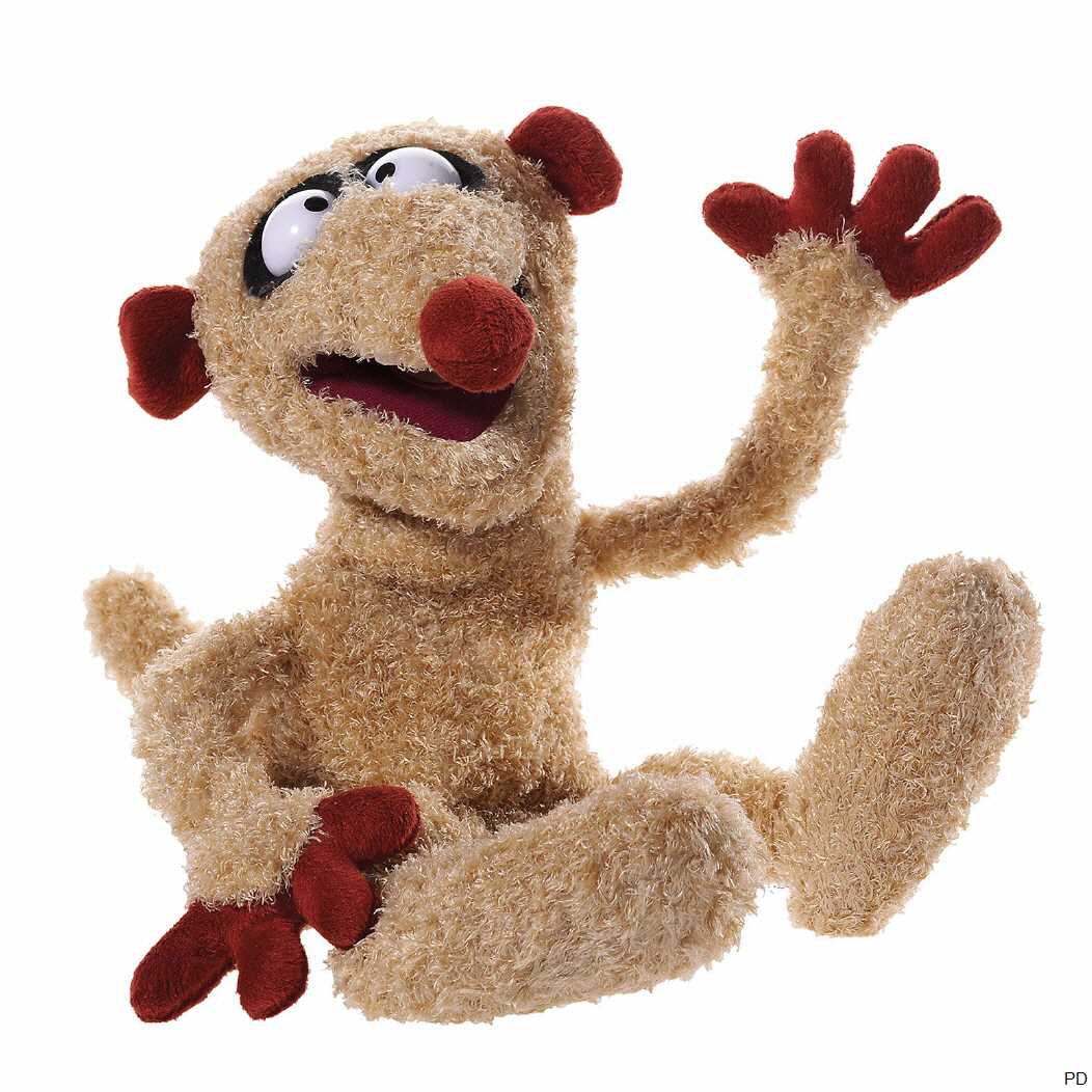 Mit seinen großen Augen und den rot abgesetzten Körperpartien schaut die Plüschhandpuppe "Henry" süß und lustig aus.