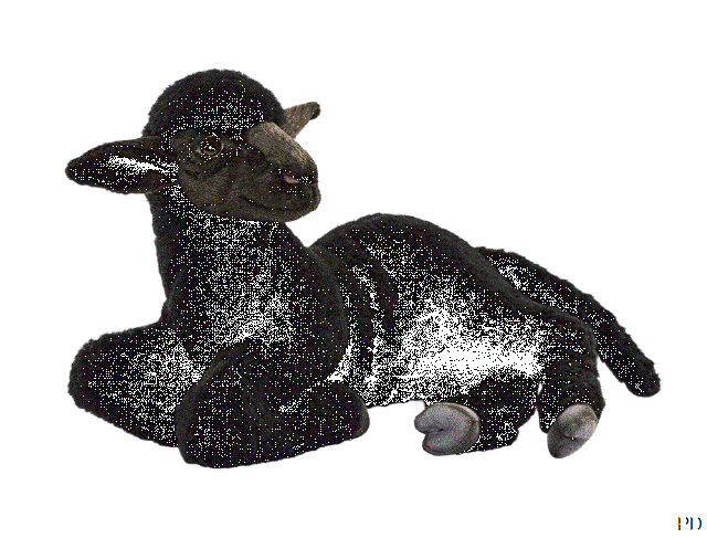 Plüschtier Lamm mit weicher, schwarzer Wolle, das Gesicht, die Ohren und die Pfoten sind grau abgesetzt.