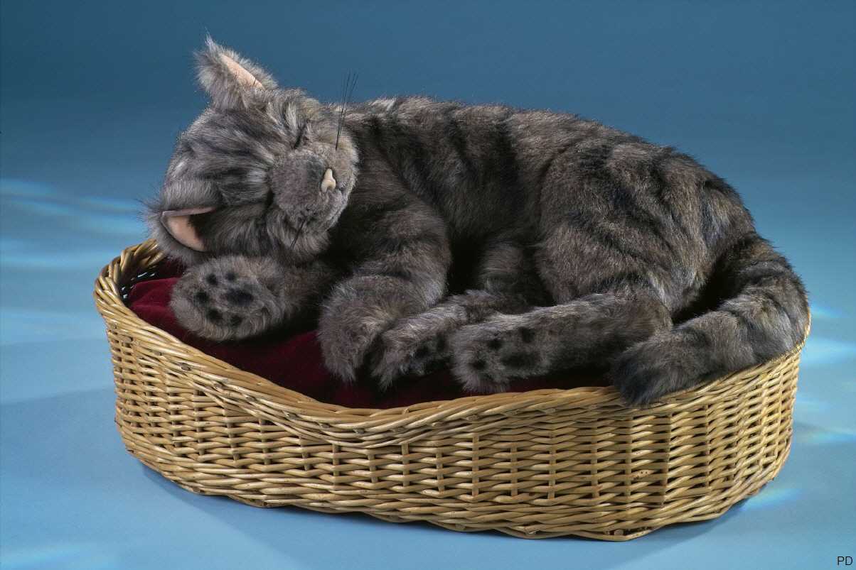 Schlafende Katze im Korb mit atmender Bewegung, 65 cm groß.