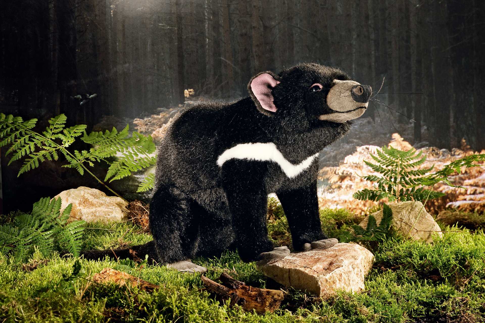 Das Stofftier Tasmanischer Teufel ist schwarz, der Halsstreifen ist weiß.