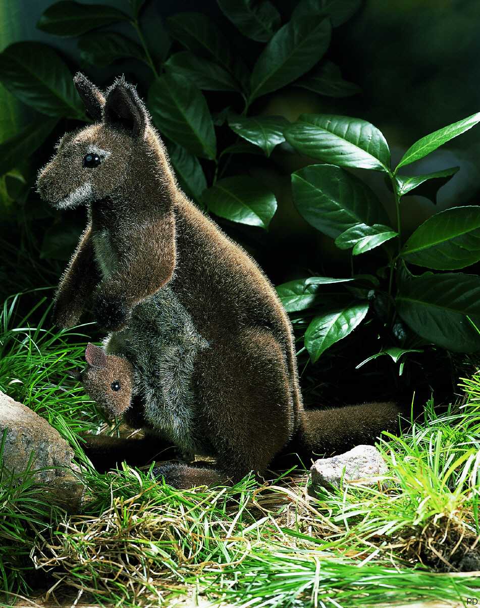 Das Känguruh ist 36 cm groß und trägt ein Kind in seinem Beutel.