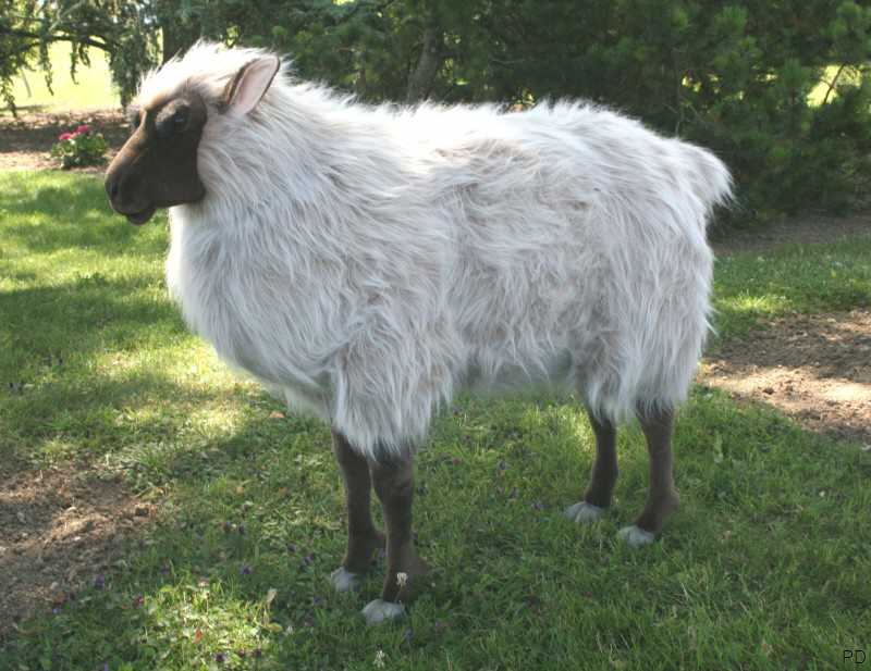 Das Pluesch Schaf hat einen langen, schmalen, unbewollten braunen Kopf und kleine, abstehende Ohren.