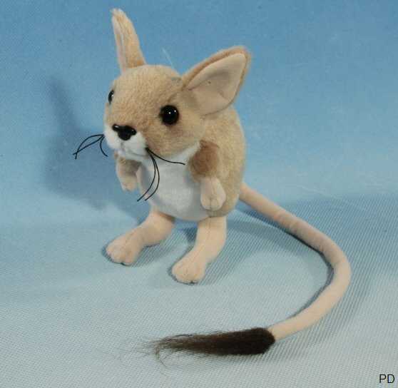 Das Fell des Stofftier Springmaus ist oberseitig beigefarben, auf der Bauchseite weiß. Der lange Schwanz der Pluesch Springmaus ist beigefarben und endet mit einer schwarzen Quaste.