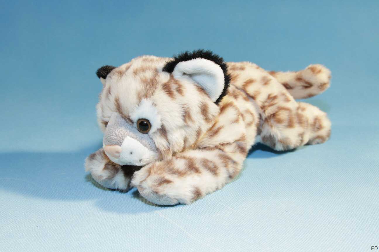 Das Stofftier Schneeleopard ist aus hochwertig verarbeitetem Plüschmaterial gefertigt. Der Körper des Kuscheltiers Schneeleopard ist weißlich gefärbt und hat braune Rosetten. Die Ohren und die Knopfaugen des Plüsch Schneeleopards sind schwarz.