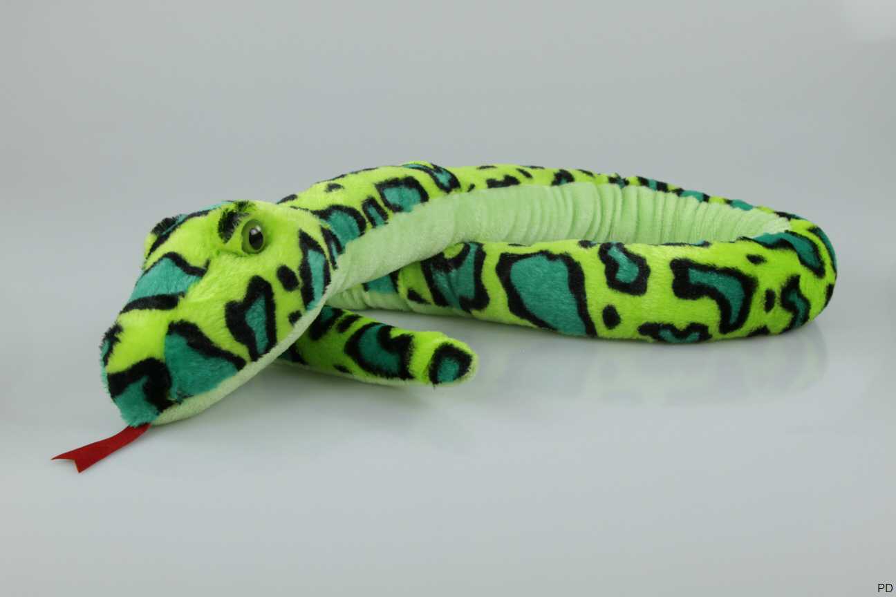 Plüschtier Schlange aus hochwertig verarbeitetem, kurzflorigem Plüschmaterial. Das Kuscheltier Schlange ist grünlich gefärbt, mit schwarz/dunkelgrünen Flecken, die Zunge ist dunkelrot.