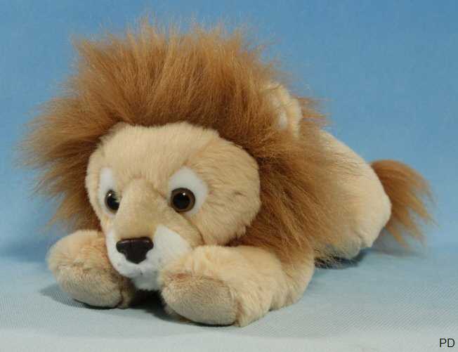 Die Mähne des Kuscheltier Löwe ist fransenartig ausgebildet und in einem satten braunton. Der Schwanz des Plüschtier Löwe ist ebenfalls braun.