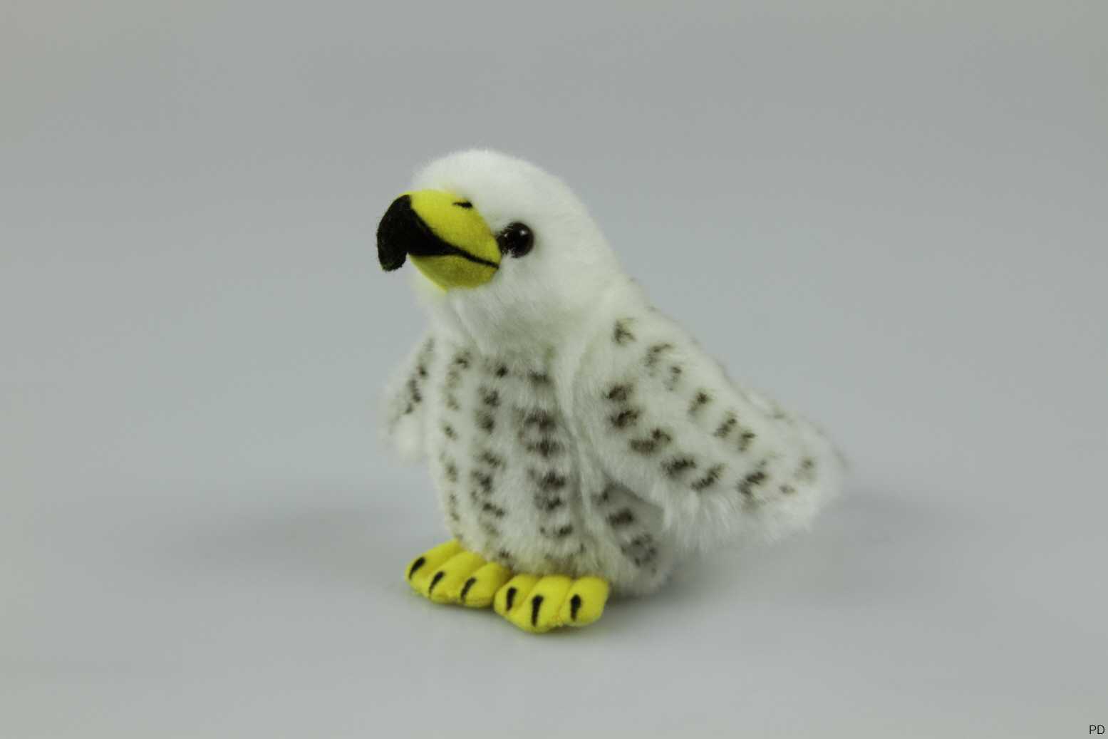 Der Körper des Stofftiers weißer Falke ist weißlich gefärbt, mit schwarzen Flecken. Die Füße und der Schnabel des Plüschfalken sind gelb gefärbt. Der kuschelige weiße Falke hat zwei schwarze Knopfaugen.