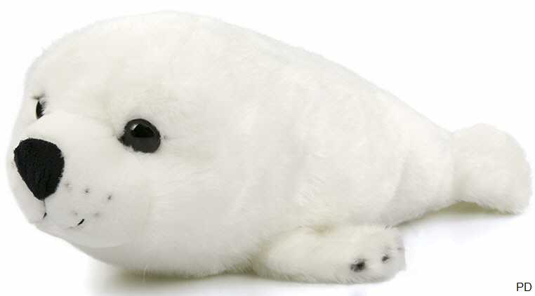 Der Körper des Kuscheltiers Seehund ist komplett weiß gefärbt. Das Stofftier Seehund hat schwarze Knopfaugen und eine schwarze Nasenspitze.