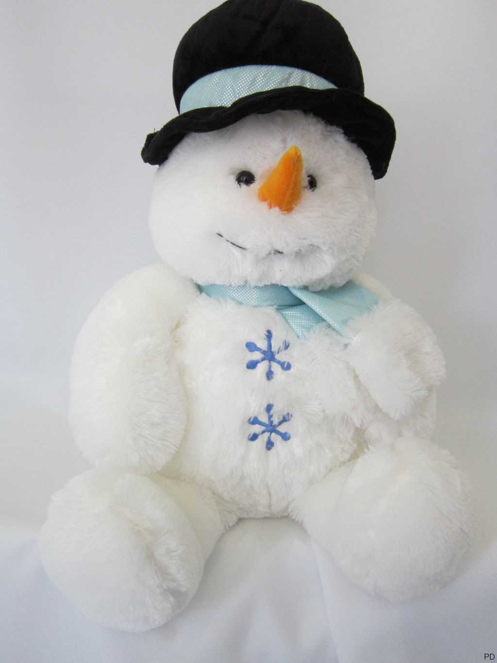 kuschelweicher Plüsch Schneemann, bekleidet mit schwarzen Hut und einem blauen Schal.