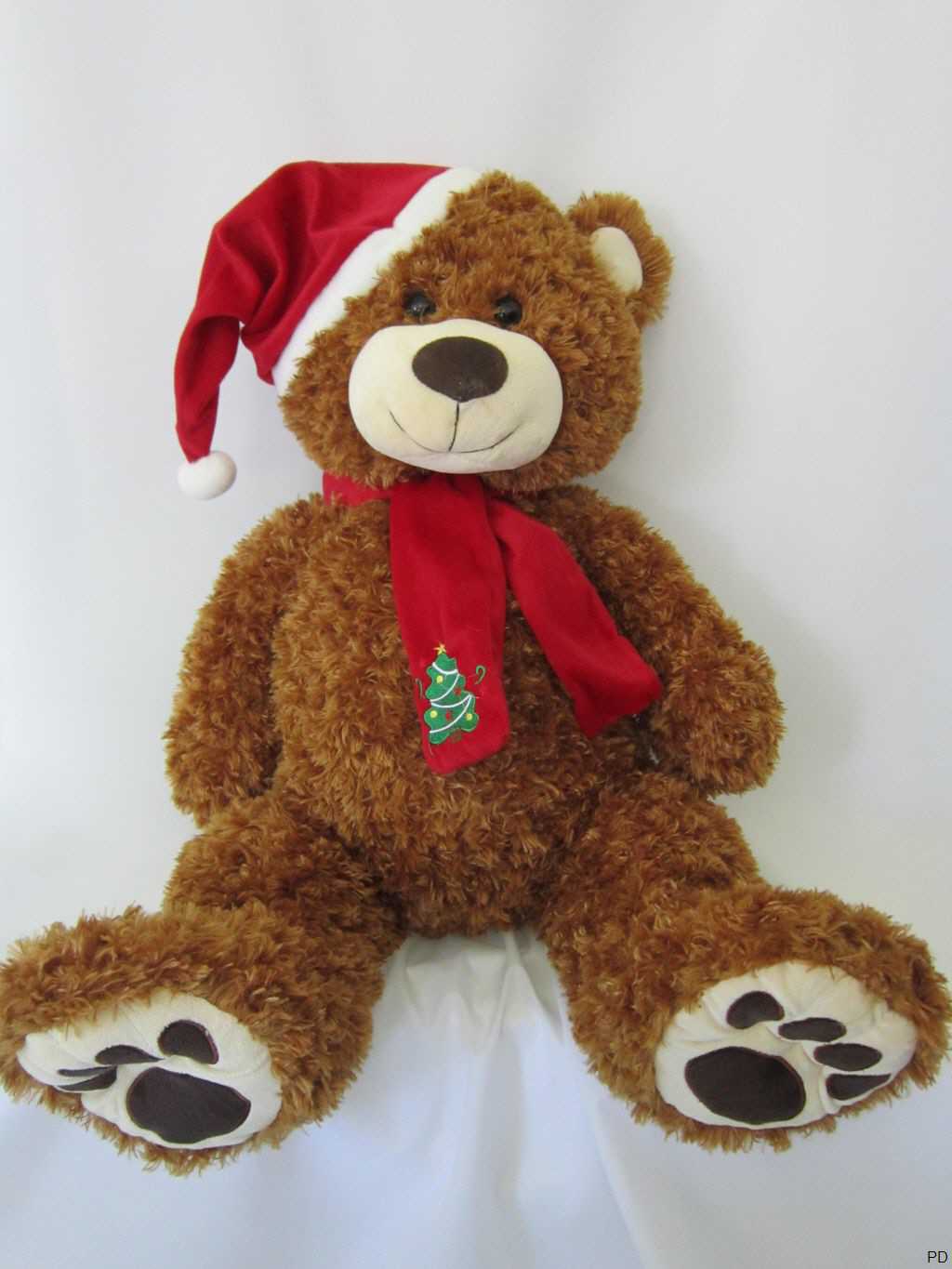 Der Weihnachtstessybär hat Bärentatzen, eine gestickte Schnauze und zwei schwarze Knopfaugen.